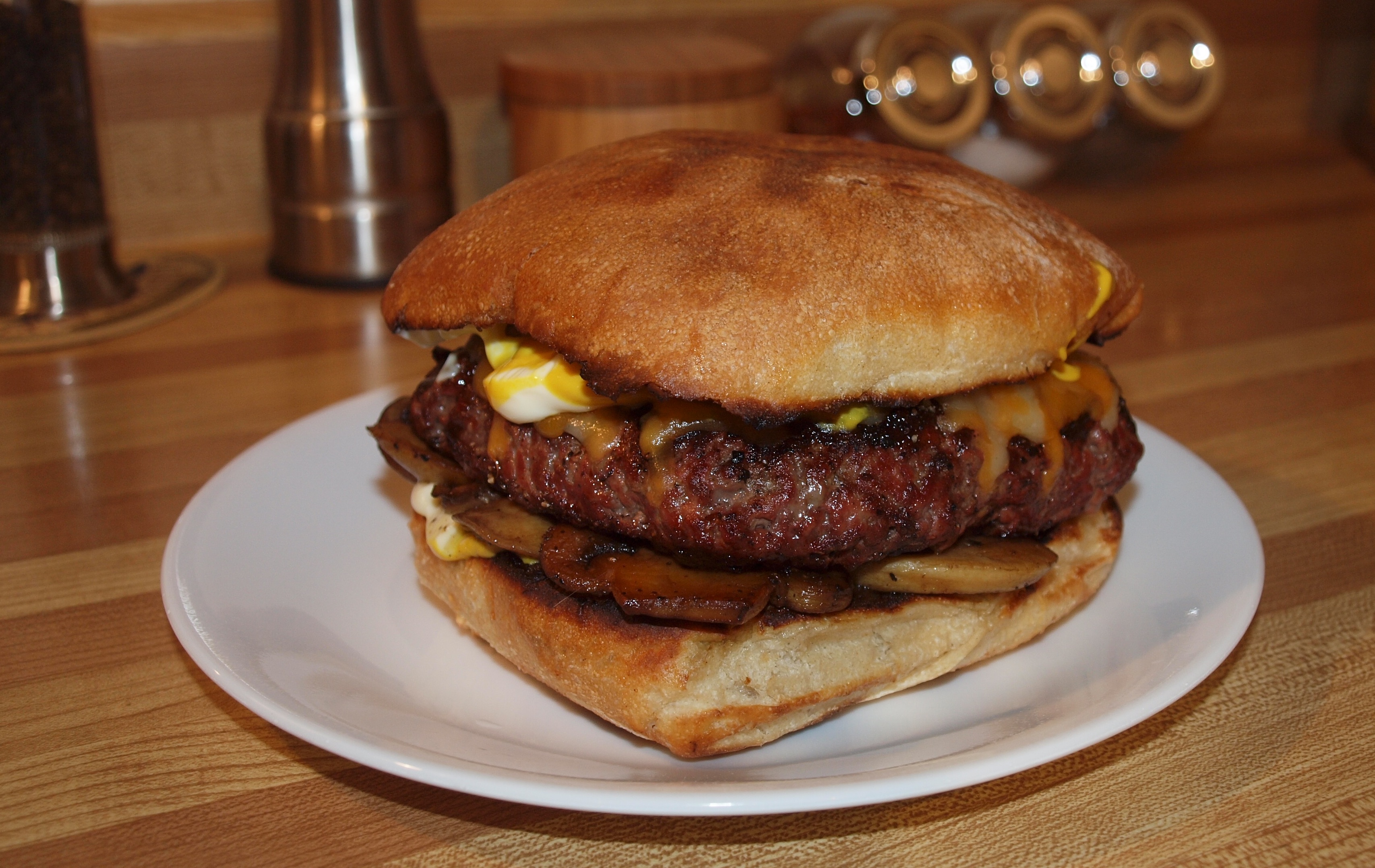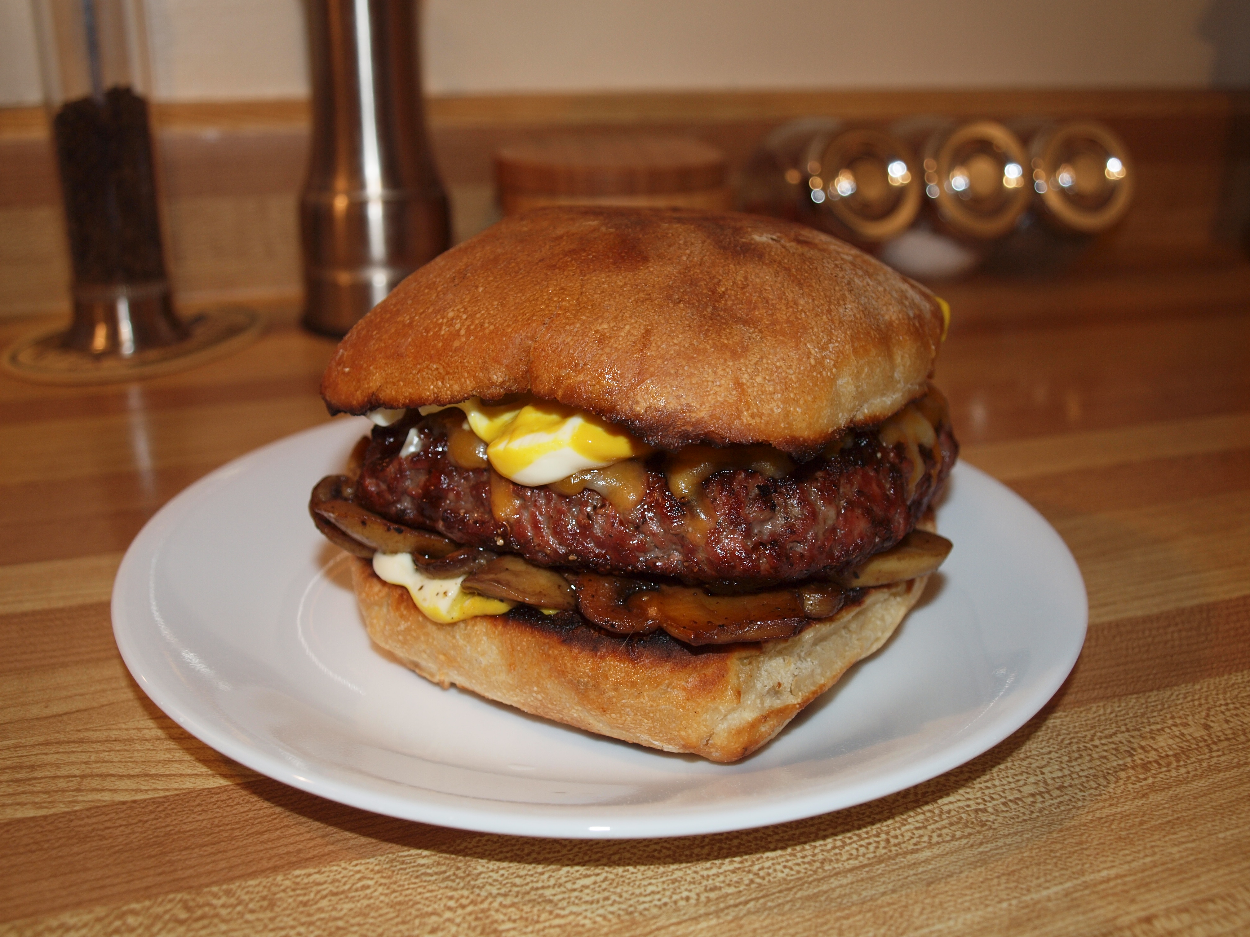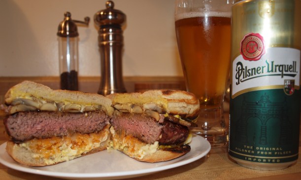 This is my version!! I was eating solo this particular day and was so craving a burger … so I went to my local market, and all they had for buns … well all they had that stood out were these lovely ciabatta buns!! I thought, why not? I also snagged 350g of freshly ground Angus sirloin. I then high-heat grilled the beef (liberally sprinkled with my secret seasonings, of course), and then the bun at a lower temp. (toasted to perfection, as you can see) and made this fucking incredible 12 ounce beauty with sauteed ‘shrooms, some Tex Mex cheese that I had leftover, and some mustard&mayo!! Notice the optimum degree of doneness (perfectly pink) when I flipped it and sliced it for ease of eating … as well as a great pic for y’all. Served alongside my trusty companion of course … a pilsner glass full ‘o Urquell, and I was one fucking happy camper … as you can imagine!!