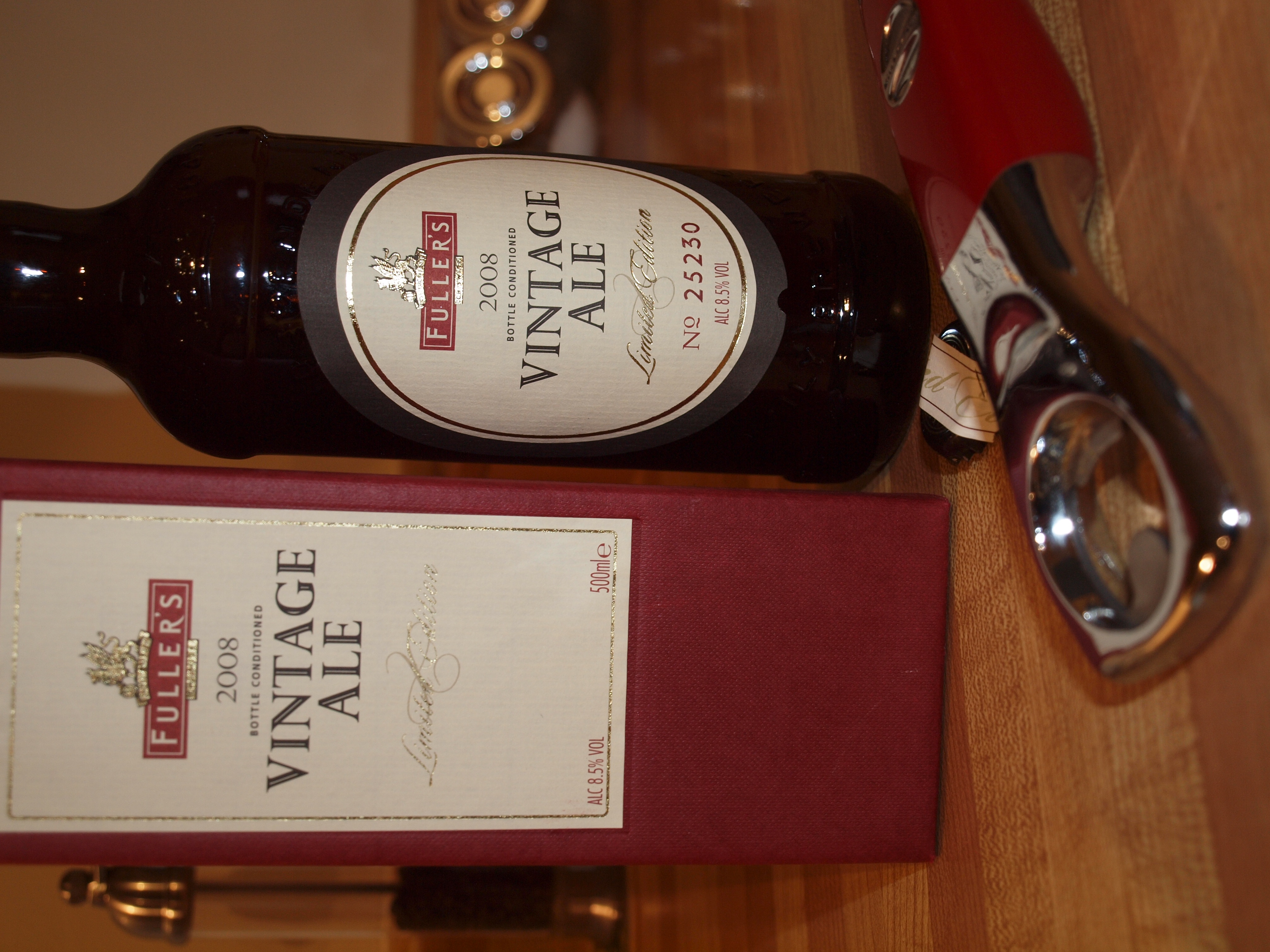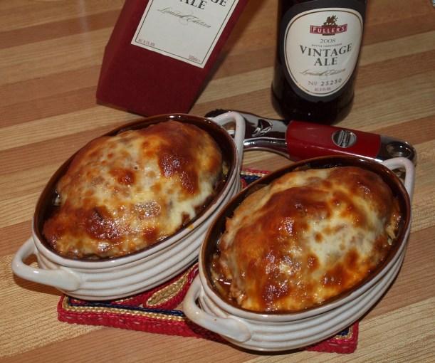 After the mad rush, days later, I created this leftover mash of osso buco, turkey meatballs, rapini, tilapia, potatoes and olives, covered with aged Auricchio provolone and baked french onion soup style in bowls specifically designed for that purpose that I bought at Crate & Barrel … along with this Fuller’s Vintage Ale I saved for a couple of years. Must say, I kinda enjoyed it more than the actual Christmas dinner, lol!!
