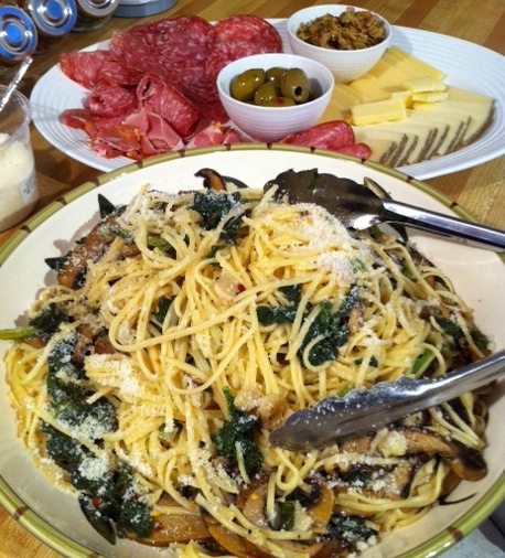 This recipe comes courtesy Rachael Ray!! The quote comes courtesy Lidia (that should suffice, if not … Bastianich … bastards, lol)!! Spaghetti, kale and portobello mushrooms … basically. I changed (tweaked) minor details … I omitted nutmeg (not a fan, used it before a few times with pasta dishes using ricotta, and just wasn’t fond of its unique taste and overpowering tendencies … certainly wasn’t subtle to say the least) … substituted chili flakes instead!! Kale cries out, screams for this, along with copious salt and black pepper too. Oh, I used linguine piccolo in place of spaghetti as well.This is actually the second Rachael Ray inspired recipe that I tried. The first one was her individual meatloafs … mini-meatloafs!! I make that all the fucking time, and always think of her when I do, giving her credit for such a great, easy idea. This time I also got the greatest tip from her … when you remove the stem from the portobello leaving the cap to be thinly sliced before adding to the frypan, she suggests scraping the ribs removing what would result in tiny black flecks covering and coating the pieces as you slice them, something you wouldn’t want to add to the dish anyways, combining it with the pasta and making a Goddamn mess of the whole thing!! Not attractive, or eye-appealing!! How fucking smart … thanks Rach!! BTW, this is completely different than when you grill them on the BBQ, leaving the ribs intact, sopping up any olive oil, chili flakes, lemon juice, parsley, and garlic goodness (my favourite combo) … or any ingredients you choose to fill the caps with!! Soon motherfuckers, soon … BBQ, are we there yet? Once again I made way too much food … this was for two!! Guess that means today=leftovers, lol!!