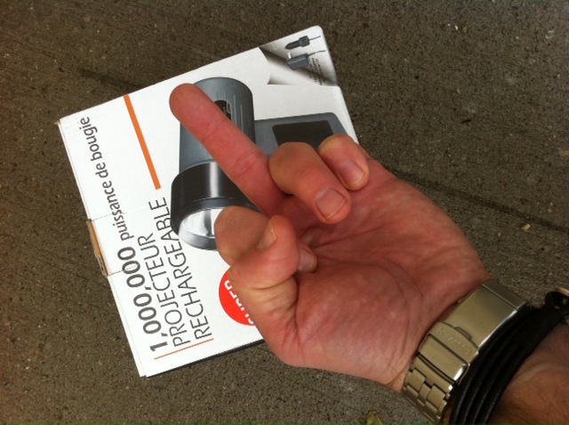 Bought this from Canadian Tire a few days back. I needed a new flashlight to replace my old one that I purchased from the same store a few years ago … least that one worked for the duration!! This one I charged after purchasing, turned it on … and nothing!! Chinese manufactured crap!! So yesterday, running around doing my Sunday errands, my joe jobs, went back to return it (not before I threw it on the ground and snapped this beauty, showing my feelings … and frustrations). Got my money back, but not my money wasting my electricity futilely charging it for 12 hours!! Believe me, if they would have said shit … I would have caused shit!!