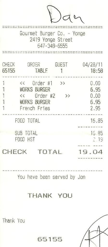 Firstly, gotta give Max credit for the quote. Get Smart. Twenty minutes prior to pick-up, to my arrival, Boy Wonder informs me he just wants to grab a quick burger before heading home, says he wants South St., tells me the location as well. Initially feel somewhat disappointed, fuck I was thinking after finishing my day, I’d be setting my fat fanny down at any number of great Toronto restaurants, staying for awhile (with any luck, a long while), and enjoying a few beers along with my meal. Boy W saw it differently, and after he mentioned his desire for cheap-eats was actually getting excited and psyched myself about finally getting an opportunity to try ‘n taste the great burgers at South St. that lately I’ve been hearing so much about. When I arrive, point out and mention to him that to get there we’d have to backtrack, something I wasn’t keen on doing. No problem he says, there’s one in our direction, just up the street too. This is the heart of uptown Toronto … Yonge and Eglinton … parking is very difficult anytime of day even at the best of times, let alone rush hour. Driving around in circles unable to park, I frustratingly drive away thinking another lost opportunity, South St. would have to wait!! Luckily, as if the burger Gods were watching over me, driving up Yonge a spot became available … a mere block away. Stepping out of the car, exactly where I parked, I (we) see this other burger place, Gourmet Burger Co. … what’s this I say? Boy W tells me about it, hasn’t tried it yet, but says he wants to. Today’s as good a day as any I figure, quickly arriving at our decision, we bail on South St. (unfortunately) and walk in!! Glad we did, burger was really good too, so sorry South St. but you still have to wait!!