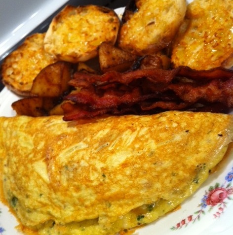 Redundancy is thy name danistrulytheman, lol!! Don’t know if I previously wrote about having this meal as my dinner though, don’t fucking care either … probably did, just making excuses, lol. I love having breakfast for supper!! Fucking love it … I love the stick-to-yer-ribs … comfort food feel of it!! Homemade hash brown russet potatoes, 2 toasted english muffins, 5 slices of bacon, and the star of the show, a 4 organic free run brown egg mushroom+hot banana peppers+garden fresh herbs+stringy gooey mozzarella cheese omellete. I made this yesterday, treated myself … a kinda culmination, a private celebration and reflection of the past week’s efforts and accomplishments!! A bit of alone time … a bit ofย danistrulytheman time, lol!! Lord knows I need it!! ๐