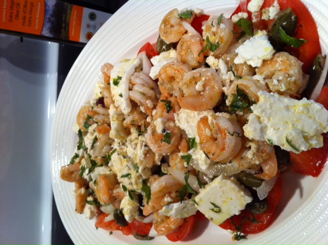 Say it ain’t so danistrulytheman? Finally a food post, lol. It has been awhile, and I’ve been cooking up a storm, just not taking pics. Too lazy, and too hungry!! Even this sole shot doesn’t begin to give this great meal justice. So, will try with accompanied words. The shrimp is PC brand, Tiger shrimp: frozen, peeled, deveined … all cleaned and ready to go, no muss, no fuss. Throw ’em in the fridge overnight to defrost, that’s it. I grilled them on my Lodge® Large Sizzle Grill Pan that I bought from Crate&Barrel recently while shopping at Yorkdale. It’s the perfect piece of equipment for the job, high heat quickly grilling the shrimp. After removing them from the pan, I lightly season, and squeeze the juice of one lemon as a finishing touch. Sliced Heirloom tomatoes and thinly sliced Vidalia onions create the base, with Caraffa gourmet olives ($33.00/kg … very pricey, but a new offering, I was excited to try) generously sprinkled next, then Greek feta haphazardly broken into pieces and chunks thrown on top, followed by the shrimp, and lots of fresh oregano and fresh basil that I picked from my garden (so early in the season, pleasantly surprised). The piece de resistance (extra special touch at least) is sparingly drizzling Acropolis Organic EVOO (purposely squeezed it into the shot, lol), providing that extra depth of flavour. Served with grilled pita bread and tzatziki … this is one of my favourite meals. Very Mediterranean, very healthy!! Served family style, on my Wolfgang Puck platter no less, lol!!
