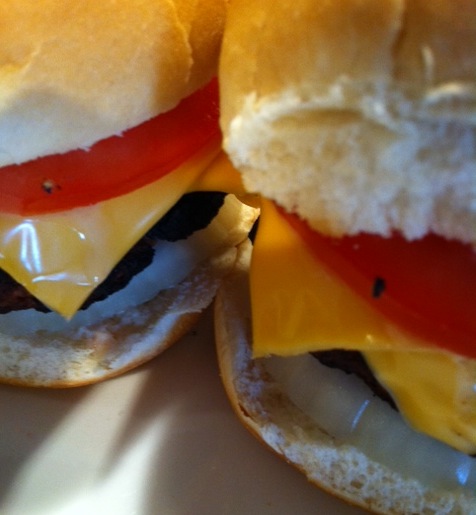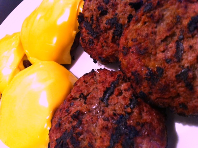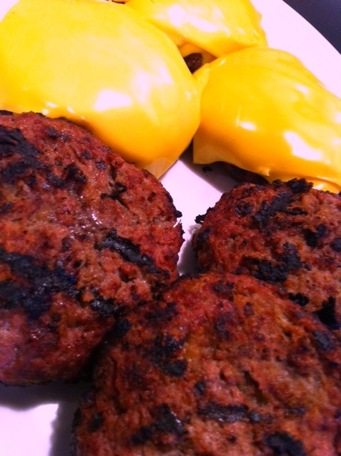 Every year, in my quest for the perfect burger, I invariably revert back to simpler times, longing for them … once (or twice) a year I try to go back to recapture these great times and memories by making my old school burgers … AND thankfully was reminded of this by my good friend’s picture of her delicious homemade burgers. These are 125 g (roughly 4 1/2 ounces, perfect size btw) … much smaller than my usual big’uns … and that’s the whole point, K(-ing)ISS … nuthin’ fancy!! Added half a grated red onion, a few squirts of mustard and bbq sauce, and tossed in about 1/4 cup of panko bread crumbs, only ’cause I had them … see that’s the thing, you can be somewhat flexible with the recipe … although I recommend grating the onion as opposed to finely chopping it … this little secret provides a couple of benefits: the added liquid (onion juice) created by grating helps bind the burger, and when making smaller burgers, chopped onions can create spaces in the meat, facilitating the burgers pulling apart and separating slightly at times. You don’t want that, you wanna tight patty (ok, minds outta the gutter y’all …said patty … LOL)!! Kraft single slices (the thin ones too, fewer calories … see, always thinking, lol) only allowed on this iteration, only basic condiments too … and of course … ONLY cute ‘n ‘lil Wonder hamburger buns permitted to this party, LOL!! Enjoy the pics!! 🙂