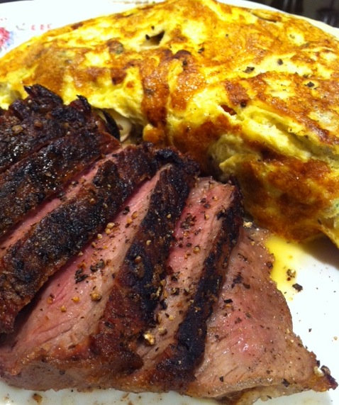 Had some leftover BBQ’d Angus striploin steak that I bought from Fortinos recently … sliced it thickly, tightly foiled it, and threw into the oven just to warm it throughout. Made my 5 egg omelette stuffed with provolone, emmenthal, mushrooms and hot peppers. Served with Thomas’ English Muffins (the BEST … and much more expensive than the other common brands, but I’m worth it, lol 😉 ), and Bob’s your fucking uncle!!