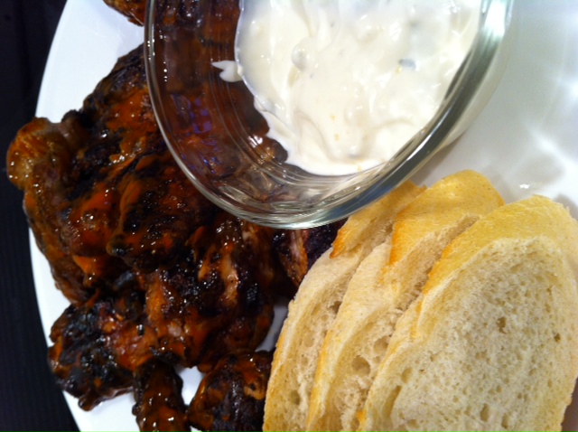 Bought a shitload of these beauties at my fave Sobey’s *eyes rolling* yesterday … air-chilled chicken wings!! Prompted by promising weather … figured why not one-last-kick-at-the-bbq-can?? Grilled ’em & glazed ’em with hot buffalo wing sauce!! Served with thinly sliced crusty bread and my home-made (secret recipe btw, lol … shhhhhh) blue cheese sauce … and LOTSA beer … let me vehemently say … life don’t get NO better!! 😉