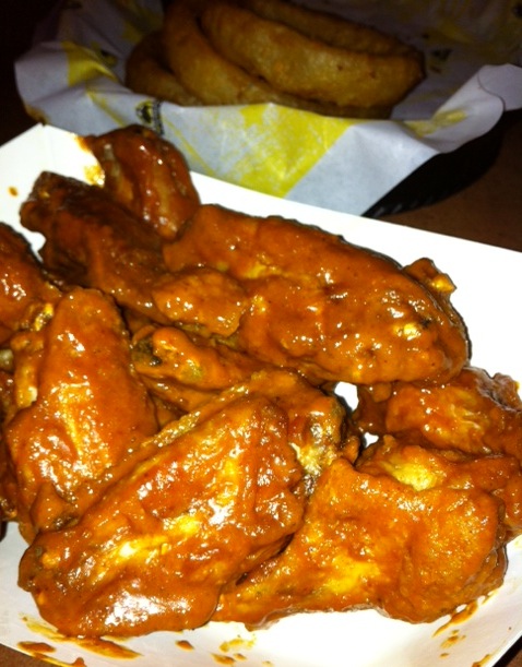 I knew I’d be ordering more wings after the Blazin’ Challenge, was thinking ten … which Rochelle Rochelle said I could split, so figured 5 Wild/5 Hot, but held off placing the order until I first completed the challenge … ‘ncase the residual heat woulda been too much to take. Afterwards said “fuck it” … ordered fifteen … AND ALL Blazin’, lol!! It’s as if I did the challenge two and a half times, lol … twentyfuckingfiveblazin’ wings … danistrulythemandontplayhalfassed!! What can I say, love, love my heat (onion rings in the background also were great) … don’t these saucy bad-boys look fucking deadly? …