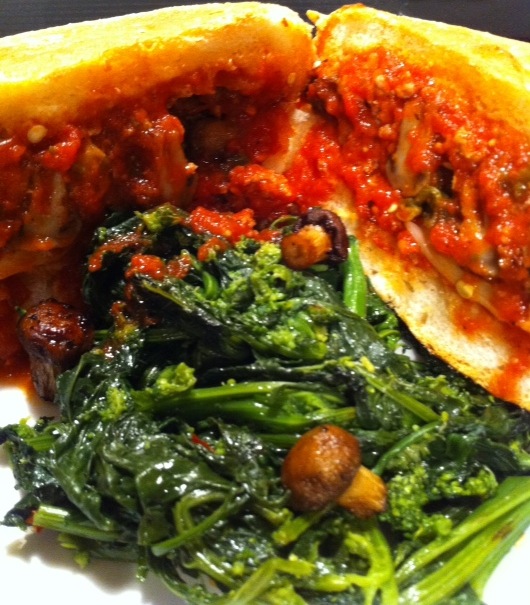 This is my classic recipe!! Ingredients can vary slightly … proportions too, typically use equal amounts ground veal and pork, a couple of beaten eggs, a handful of romano (or reggiano), chopped onion (sometimes grated), a clove of garlic finely chopped or minced, breadcrumbs (sometimes panko, sometimes not), and liberally seasoned with salt & pepper and marjoram and/or oregano, then thoroughly hand mixed and formed into slightly bigger than a golf ball size. Pan fried in olive oil to sear ‘n blacken the balls, then plopped into a stock-pot of my home-made marinara sauce, and finally allowed to gently simmer for a couple of hours. Great on pasta … spaghettini or linguine, but LOVE it in a sandwich too!! Today also included roasted mushrooms, two kinds of peppers and melted aged provolone in this heaping feast … oh and served with danistrulytheman’s ubiquitous broccoli rabe, lol!! VERY IMPORTANT: Must be served on a crusty Italian roll (this ain’t no white bread soft ‘n mushy mangiacake sub sandwich) sopping up all the oozy-ooey–gooey-goodness!!