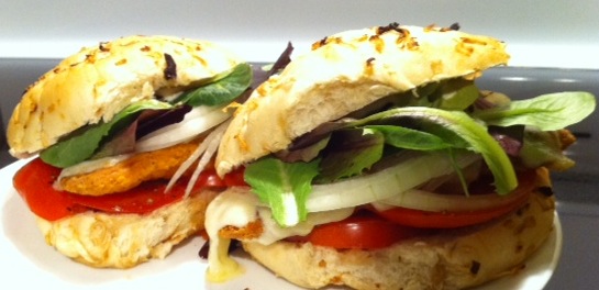 Onion buns from Longos, spicy chicken breast from M&M Meat Shop (200 cal), melted provolone, organic baby romaine, organic hot house tomatoes and sweet onions, and just a squirt of Hellmann’s 1/2 the fat mayonnaise … I’m guessing 500 cals per sammy, maybe 550!! Double that, add an extra 100 calories to be on the safe side, and it’s still only 1200 total … that’s the beauty of it, you feel as if you’ve splurged and over indulged, when in fact you didn’t. Plus being hearty, curbs late night snacking urges … and like I said, it’s very healthy … and GOOD!!