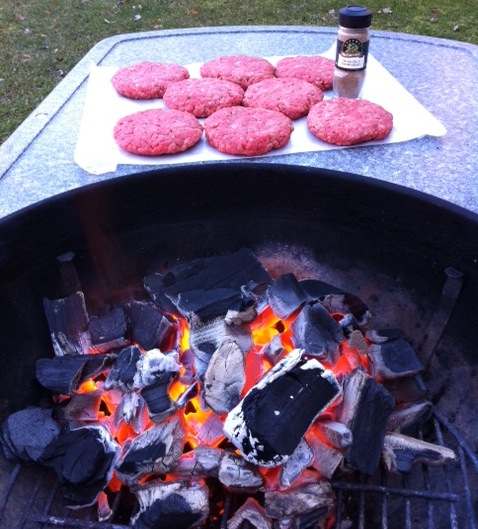 8 perfect hand formed 6 oz. patties (note the celery salt, a 1st time trial) waiting for the wood charcoal to get white-hot, just a few more minutes …