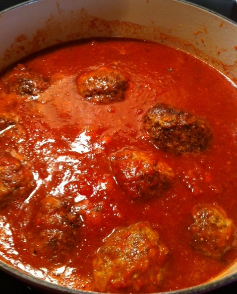 This is my favourite part … all the meatballs added to the sauce, most submerged, some not … LOVE that blackened look …
