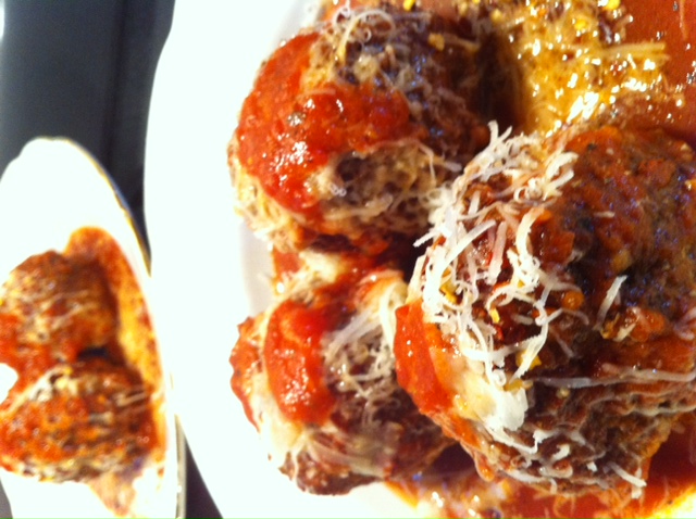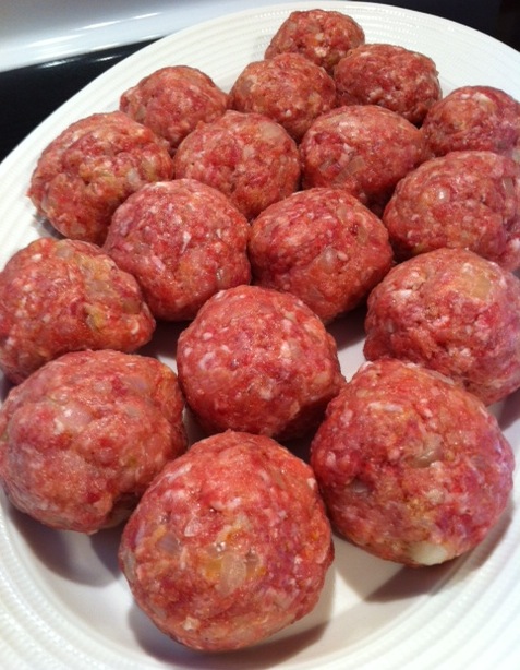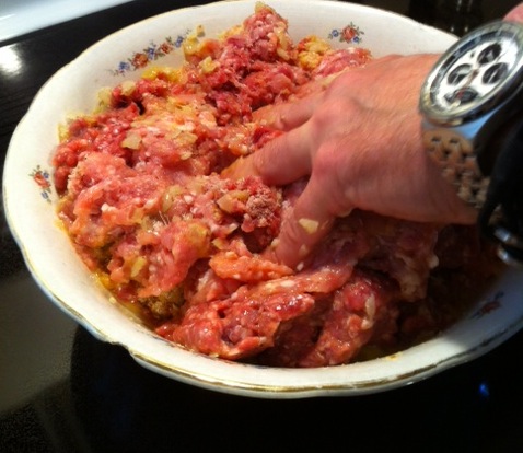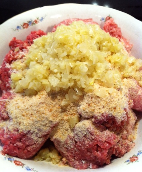 Combine equal parts ground veal and pork (seasoned liberally with salt and pepper) with 2 eggs slightly beaten, freshly grated cheese, breadcrumbs, and the onions and garlic. Used two types of Italian cheese this time, kicked it up a notch, lol …
