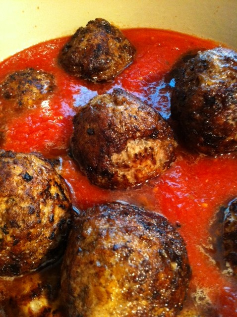 This is my favourite part … all the meatballs added to the sauce, most submerged, some not … LOVE that blackened look …