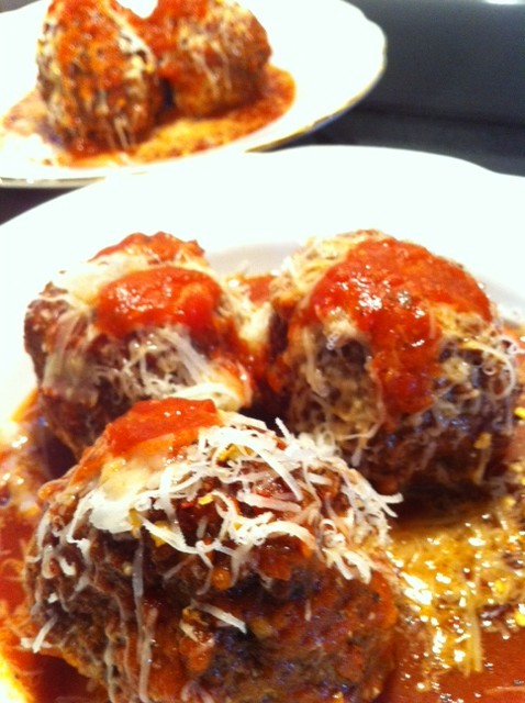 Combine equal parts ground veal and pork (seasoned liberally with salt and pepper) with 2 eggs slightly beaten, freshly grated cheese, breadcrumbs, and the onions and garlic. Used two types of Italian cheese this time, kicked it up a notch, lol …