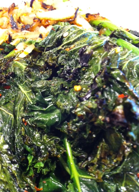 … just a few pics, fresh Ontario grown kale (on sale of course, lol)!! Something completely new (who knew?!) … looks AWESOME, can’t wait to try it … but RIGHT NOW have more Weber wood grilling to do before I can dig in  … we’re real time blogging here folks, lol!! Sweet onions, slivered garlic … copious sea salt/freshly ground pepper then sprinkled with chili flakes … sorry, gotta go y’all … roasted creminis, NY strips, and grilled garlic focaccia awaits …