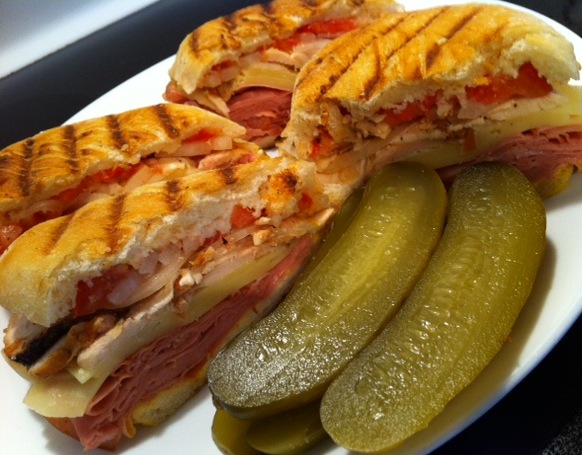 Still working on (stretching and stretching AND modifying/reinventing) my grilled chicken breast from the weekend … yep, leftovers again. Quick in and out at my Highland Farms and I was good to go. Initially wanted bacon along with my chicken … but I’ve done that a gazillion times, and seeing mortadella on sale for $2.99/lb suddenly began thinking economically as well as inspirationally … and you know what? It worked! I’ve never seen this combo before, and a little part of me would like to think I invented the damn thing. Picked up some Portuguese rolls, creamy havarti, heirloom tomatoes, sweet onions, and Mrs. Whyte’s kosher pickles. Using my heavy duty (really … I mean HEAVY) Molto Mario grill pan, I panini pressed these beauties!!