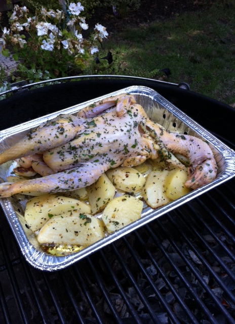 OMG … been meaning to buy/try/give this a go for SOOOOO long!! I have friends in the chicken wholesale business, they’re Chinese and they SWEAR by this bird … say it’s the best bar none (I’m certain it’s more grain fed, more hormone free, more free range than anything available – and judging by the supply/demand AND price, I’m REALLY certain). Limited shipment arrives once a week (Wednesday or Thursday … if at all, some weeks … ZIP BABY!!), and customers are constantly calling (they also do a limited retail business with those in the know … and I know) in anticipation. And come early, in a matter of hours, it’s sold out city!! Unbelievably, today was my lucky day … you should hear it in there, shoppers asking specifically for gender of their choosing (apparently males have a stronger taste, females smoother and sweeter – ain’t that always the way, lol?) … never heard/knew of that in my life … AND, I was told to keep the chicken intact while cooking, to chop off/discard the head and feet AFTERWARDS only … AND this wasn’t negotiable … something about juices/flavour spilling out … if you say so – hell, who am I to argue, lol?! After purchasing … immediately in my mind figured I’d south-western spice rub it, mop it with a killer BBQ sauce to finish … but with time to make a wiser decision … and with my garden overflowing with fresh Italian parsley, 2 types of sage, oregano, thyme, rosemary and oregano, opted instead to go Mediterranean. Didnt stop to pick up groceries (normally, I’m set in case of emergencies – had potatoes and lemon), but when I got home realized I didn’t have tzatziki, keep in mind this meal SCREAMS it – I love tzatziki more than I love my kids … OK OK … it’s a coin flip, lol … and away I went … what’s good for the spuds, is good for the chicken … so important to reinforce flavours  … and later admittedly, was happy fridge was sans tzatziki … best not to bastardize my first attempt at this … and KISS!! Oh, also … didn’t go nuts on crispin’ the skin … my preferred method, not theirs … once again too much flapping lips (do chickens have lips, lol?) … my yellow chicken, potatoes, sweet onions, garlic, lemon and fresh garden herbs oozing in mouthwatering chicken drippin’ creation … enjoy!! 😉
