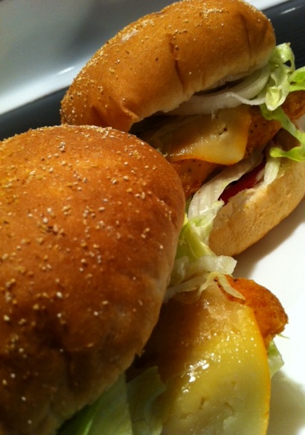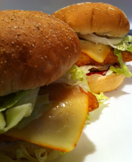 … or monster-sized … it’s a pick’em, lol!! Made these huge-ass spicy flavoured chicken breast (from M&M) sandwiches again … Crustini Buns from D’Italiano, loaded with shredded iceberg lettuce, thinly sliced sweet onions, thick sliced heirloom tomatoes (sorry, hidden in all the goodness, lol), a splash of 1/2 the fat mayo, and the silky smooth meltingly shimmering aforementioned Muenster … I LOVE LOVE this … and the beauty, all in – it’s 800 cals for the twins … looks like they LOVE LOVE me back, lol!!