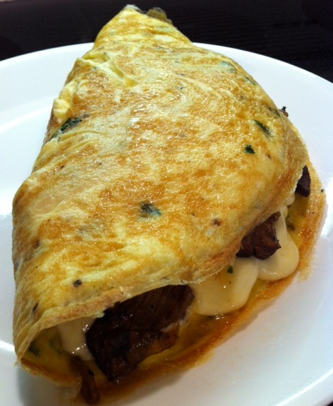 … almost souffle like!! Something I’m strivin’ for when whipping up an omelette. The shape, (ain’t bustin’ open – staying intact), colour & texture look perfect … almost as if I used a mold, lol. Threw in leftover steak, onions and mushrooms … that’s Monterey Jack cheese you see oozing out … fill it as you please. Oh, and it’s 4 of the most free run, hormone free brown eggs ya can get – that’s key btw, use the best/freshest eggs … ALWAYS!!