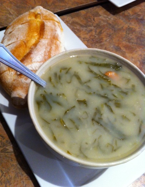 Portuguese sausage – Linguiça … to be more precise – this ain’t no run o’ the mill Italian sausage (which are great btw) that I’m accustomed to. Once you bite into these, you’ll never forget its distinctiveness. I often see my good friend John with take-out styrofoam containers (so often – I bust his balls ’cause of it, lol), with soup (everyday they offer something different, not that I have to tell you – but just to make it perfectly clear – I AM, lol) from this place (I’ve never been, although I’ve been to many, many Portuguese bakeries) – Courense Bakery on Bloor … and ALWAYS raving about how great it is … and he swears by its health benefits (and he was right, felt stuffed all day afterwards). Today, because of circumstances – and because I was hungry as a motherfucking horse at the time, John and I ventured for a sit down soup brunch – got there at 10:45. John said this was the optimum time, come on noon’s other side and you’re taking a big risk … chances are you’ll be shit out of luck and a sorry sold out soup sob story is what you’ll be hearing … and then, you wouldn’t even be able to cry in it, LOL!! When we entered, the young woman working behind the counter asks me if I like kale and sausage? Uh, HELLS YEAH, lol!! And I know I’m not a soup guy, but after today’s experience, promise to try being MORE of a soup guy …