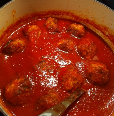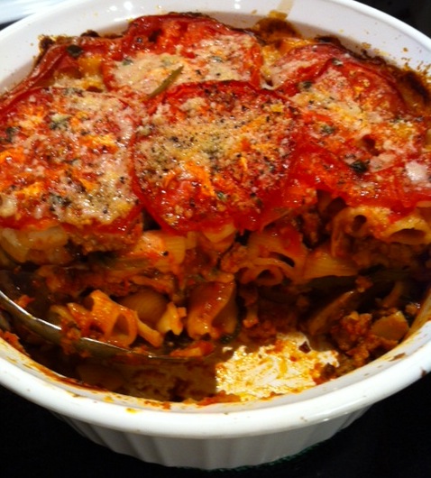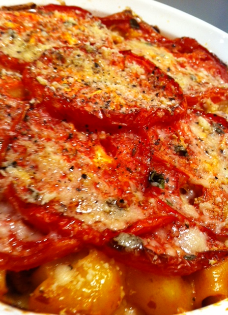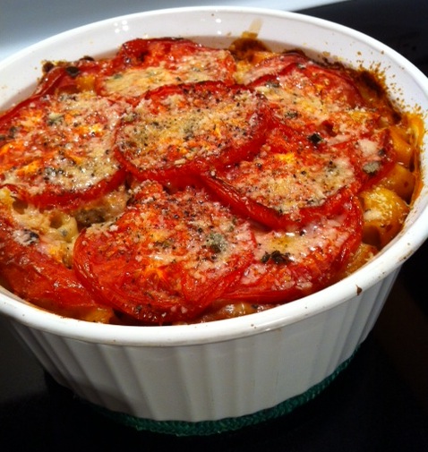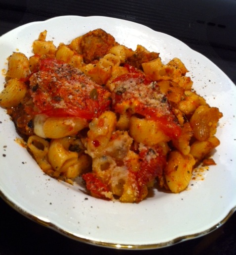 … and properly fancied it up, tired of always mangiacaking it down … oh what the hell – Meatballs with pasta, lol!! This creation came courtesy leftovers (once again), a coupla days back I made a batch of my famous meatballs and homemade sauce. And later looking to vary and extend it further, came up with this … it’s a baked pasta dish (my favourite way of cooking it btw), and that sliced tomato (I’ve NEVER done that before, but I had a very ripe one – and remember; waste not, want not) inspiration was something I’ve seen … I think it was from Lidia (Bastianich), maybe it was Giada (De Laurentis) though?! Cooked the pasta in my stock pot full of boiling water and with a ladle full of sea salt – should taste like the ocean, until very al dente, then drained (but with a bit of the pasta water reserved) and finally combined with the meatballs and sauce … oh, I did layer Auricchio before finishing with the tomato (and that’s Grana Padano grated on top when I pulled it out of the oven) … some pics, enjoy – mangia mangia!! 😀