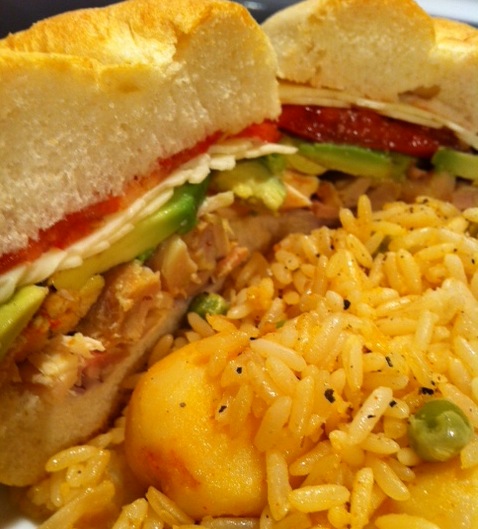 my latest helping-my-sorry-old-ass-body kick that I’m on. loaded with lots of the good stuff. a quickie google search, and you’ll know what I’m talkin’ ’bout Willis!! today I made sammies on Italian rolls; leftover chicken, red onions, hothouse tomatoes, havarti … and my new superfood friend, the avocado. reheated rice and potatoes (more leftovers – waste not want not) served on the side and bob’s yerfuckin uncle. a coupla pics y’all.