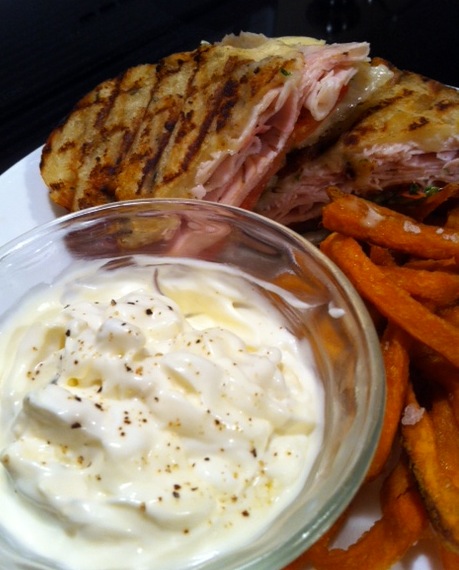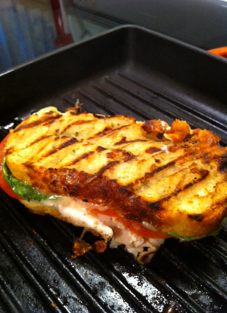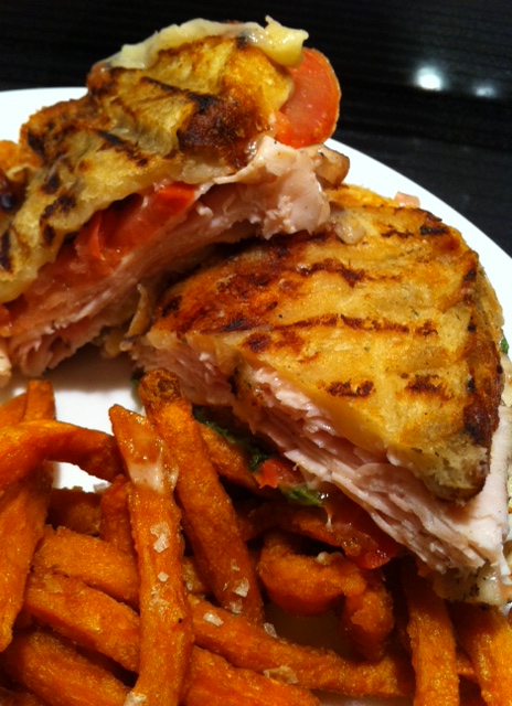 … a quickie post, a few pics y’all. Thinly sliced oven roasted turkey, havarti, Boston lettuce, hothouse tomatoes, low-fat mayo and my favourite Yukon Gold potato bread. Used my Mario Batali grill pan, and made a quickie cambozola dressing for the sweet potato fries – oh, and that’s Maldon sea salt flakes too. Enjoy!!