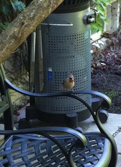 Wondering why the nonstop tandem Cardinal dive-bombing as I nonchalantly went ’bout my business, strolling back and forth the side of my house doin’ my waterin’ duties?! Don’t they know all that chirping and flyby buzzing BRINGS attention to cluelesshuman exposing all attempted covertness? Brainless birds!! Didn’t take long for cute-as-a-button-chickie to hopelessly happen by …