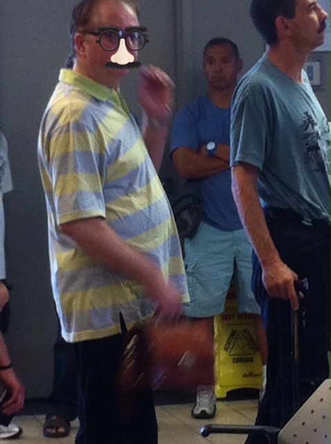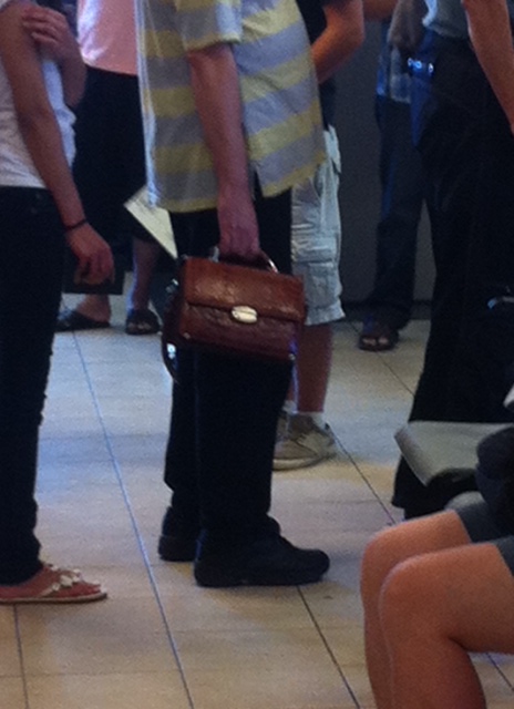 Queued to the gills, up the wazoo today … being somewhere I didn’t want to be. You know when people say the line was a mile long? It was! And since I was already wasting time (wasting MY time) … I had nothin’ better to do than surreptitiously snap these few pics of purse carrying man! I even waited till the line snaked back around before I sprung into action, getting a better shot. C’mon, man bags typically have shoulder straps, and if they don’t, they’re bigger … AND slimmer. THAT’S a fucking purse, LOL …