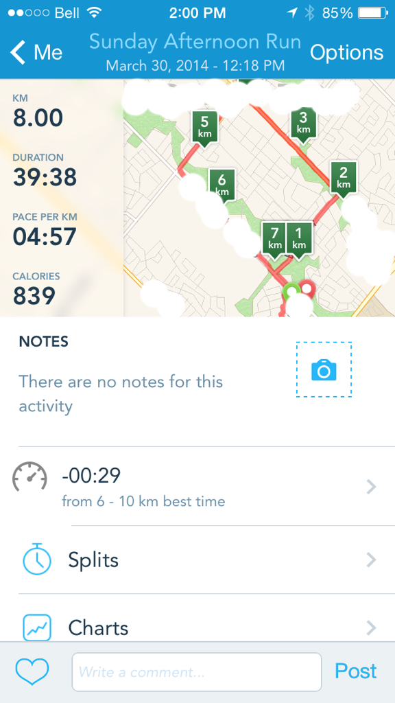 Exactly what I wanted/expected! I almost stopped a million times, but I didn’t … I pushed. I wanted my 8K, I got my 8K. Considering it’s my 1st run of the season, and that I’m about 8 pounds away from optimum running weight, AND, that it’s still mucky, so much debris from the ice-storm littering the sidewalks – felt more like a mud run than anything, lol … I’m very pleased! Yep, right where I wanna be …