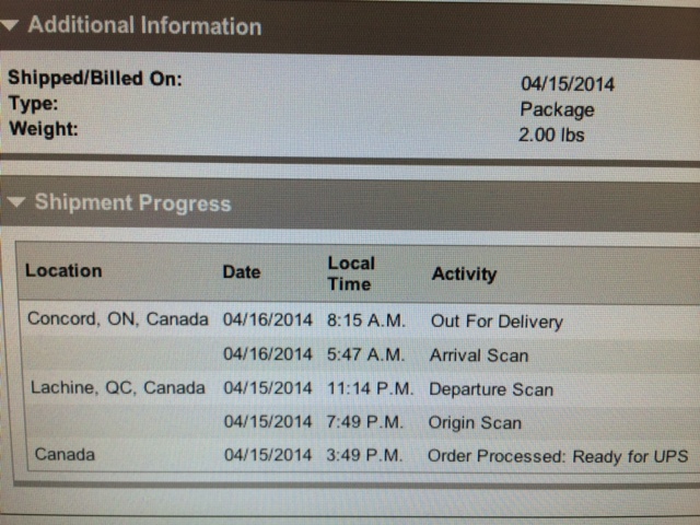 UPS tracking info; from Quebec last night, to Concord and out for delivery at 8:15 a.m..
