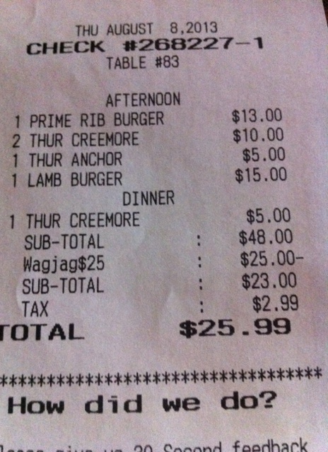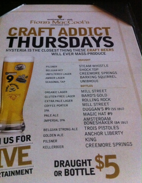 … we WagJagged the shit outta the joint! Tiff signed up for the typical coupon rate – pay $10, get $20. ‘Cept she was asked to complete a survey (said, it wasn’t even really a survey, only a few questions) and would be credited $5 for doing so. Hello? Freebies for Tiff are a no-brainer, lol! And Fionn’s was tacking on an extra $5 worth of fare if you used the WagJag within the first four days it became available. We went day one, lol! Bottom line: $25 credit (for a measly $5) before we even set foot in their PaddyAss pub … AND with our luck o’ the Irish, it was a Thursday, just so happens, it’s $5 craft beers night (they also offer other day of the week specials, but nothing to match this one). Anyways, a few pics (shitty pics, lighting was iPhone awful) …