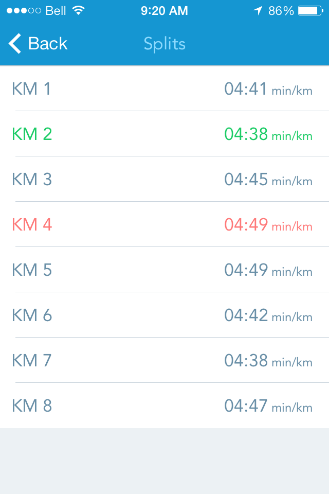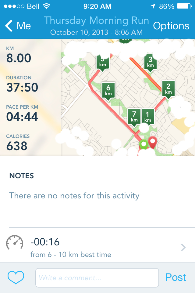 … today was another good Saturday run, was running crazy fast from the get-go … 1.13K after 5 minutes, 2.3K after ten minutes … but at my fifteen minute cue, slipped a bit (1.08K), and I felt a 4K PR was gonna be too close for comfort, think I started panicking/tightening up … so I bailed, and clicked “stop” … a mere minute and a half away from my marker (douce-bag personified … I know) … and in 52 days of running, I’ve NEVER quit running hard to my halfway point. I was proud of that. That’s what I love about my circuit. Every step towards my 4K mark takes me further and further from home … and after those 18-19 minutes have elapsed … every step conversely leads me home. I run hard without any back-up plan, no one’s saving my sorry-old-ass … after hitting my halfway point, I know I gotta run home!