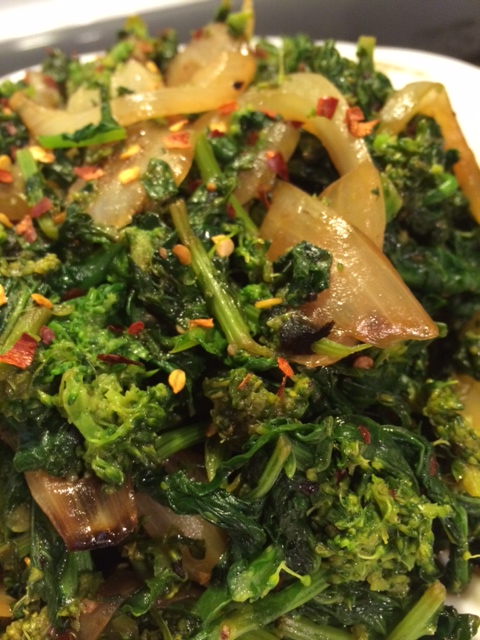 Yep! I said it (my fave btw)! And, in my Le Creuset dutch oven no less! Not one to read/follow rules, prefer to make up shit as I go … bear in mind, many, many years of cooking/techniques in my back pocket help. I get the pot to a scorching high heat, add olive oil (here’s the secret blogging tip: start w/ very little olive oil and continue adding if needed as opposed to the opposite. It’s very important – keeping in mind the onion and rapini will release liquids as you keep cooking. It’s very crucial you allow for this compensation. For this grilling method we want dry, not wet. We can always add, can’t subtract), then the sliced onions, seasoning as I begin searing. After a few browning moments, next comes the broccoli rabe followed by more seasoning. Look at how high heat fry cooking essentially grills everything w/ not a hint of sogginess! Sweet! A final sprinkling of chili flakes seals the deal! Enjoy!