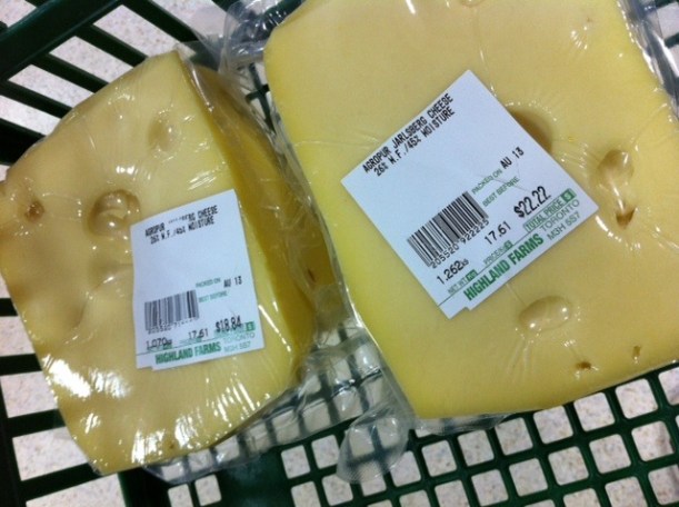 Couldn’t believe this while perusing my Highland Farms online flyer … Jarlsberg Cheese half price … $7.99/lb ($17.61/kg)!! Don’t know where you’re from and what y’all normally pay for it … $16/lb is the going rate in these parts … sometimes on sale for ten bucks if you’re lucky, and only if you know and are able to score it that is (lowest price I’ve ever seen btw), AND that’s only precut prepackaged wedges with the skin/rind on … this was available anyway you wanted it sliced (LOL, sorry for the cheesy pun … and again, ooops, lol). It’s one of my favourite go to cheeses, its flavour, texture is distinct … not overpowering, but not too mild either … love it in sandwiches, on crackers … great for any and many uses. And being a long time loyal, friendly, beloved Highland Farms customer … my cheese lady friend sliced off the throwaway bits before weighing & pricing saving me more money (scaled and priced with the rind was almost $45 – with it cut and discarded about $41 – saved $4), AND she vacuum sealed the whole deal for me (a service NOT offered I was told … looks like I AM special, lol). Oh, this was my second trip too … went first day during their one week sale and spent about $25 on smaller pieces … good thing I went back again midway through the week, CLF says they’re almost sold out, only a few wheels remaining … and she’s not sure if they’ll be restocking (or if they’ll give raincheques) before the sale ends … oh well, I got mine, lol!!
