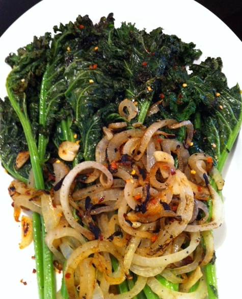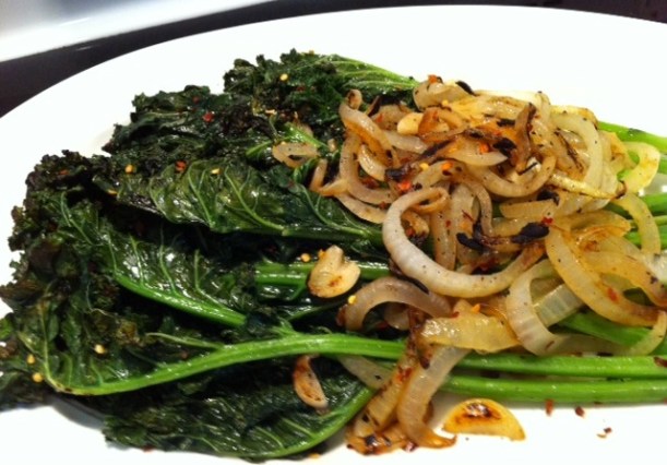 … just a few pics, fresh Ontario grown kale (on sale of course, lol)!! Something completely new (who knew?!) … looks AWESOME, can’t wait to try it … but RIGHT NOW have more Weber wood grilling to do before I can dig in … we’re real time blogging here folks, lol!! Sweet onions, slivered garlic … copious sea salt/freshly ground pepper then sprinkled with chili flakes … sorry, gotta go y’all … roasted creminis, NY strips, and grilled garlic focaccia awaits …