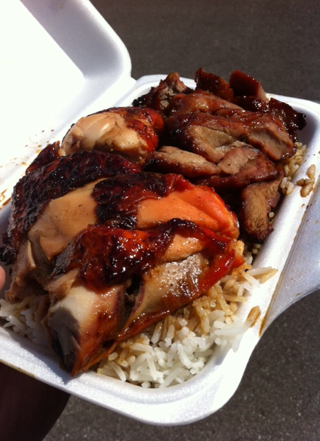 BBQ chicken and pork over rice in the ubiquitous styrofoam container …