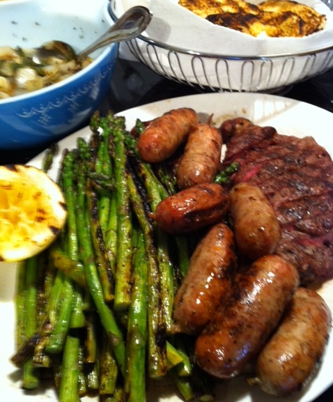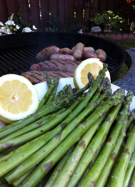 A couple of New York Strips and strung piquante sausages … startin’ gettin’ their char on!! Asparagus patiently awaits: