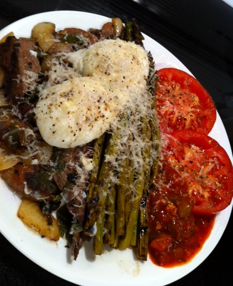 And the best part (as always, lol) … leftovers!! A bit of a change-up (or is that curveball, lol?) A quick steak and sausage stir-fry, along with my onion/poblano mix (marries together so beautifully, can’t begin to tell ya how good it is), steamed the asparagus, poached two eggs lightly (I’m talking running yokes folks) and freshly grated (coarsely) parm-regg as a finishing touch … AND a dollop of Sofrito, AND sliced hothouse tomatoes to boot, LOL!!: